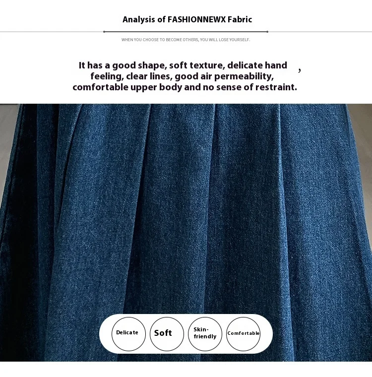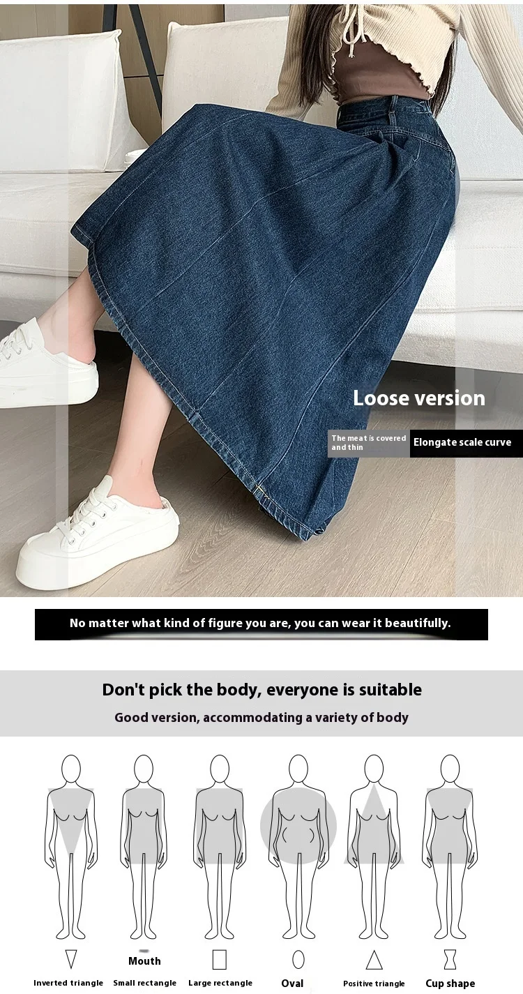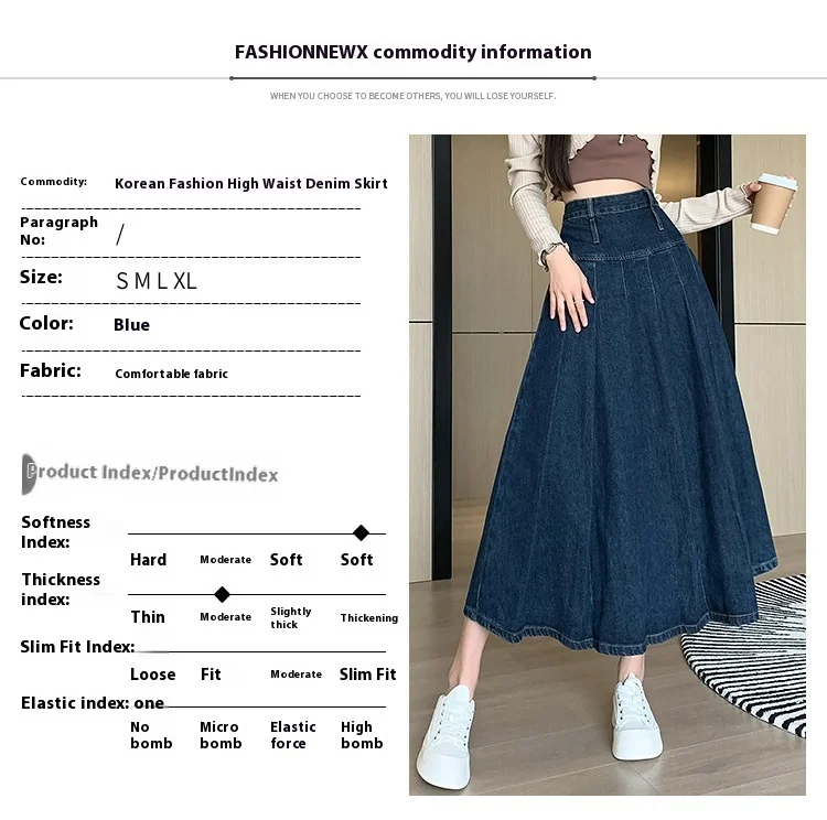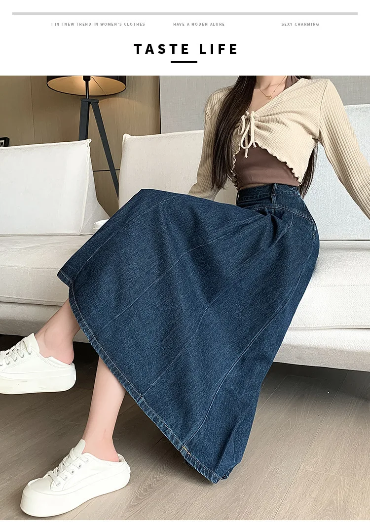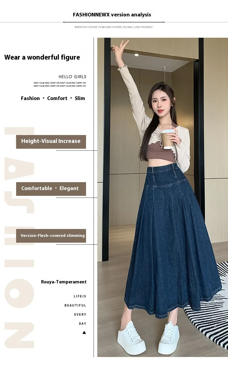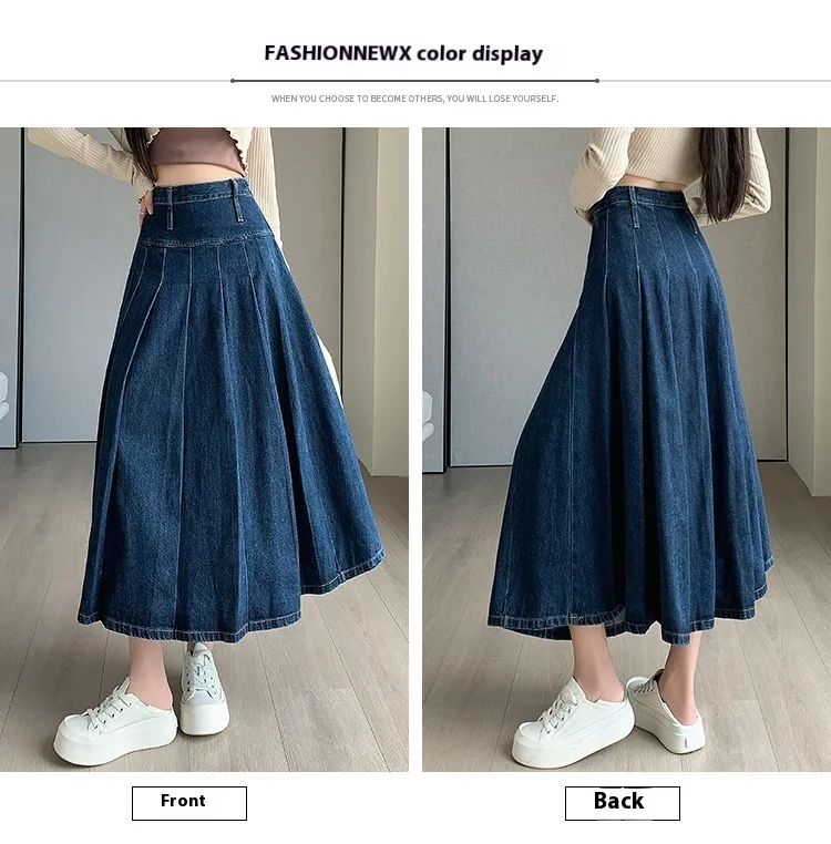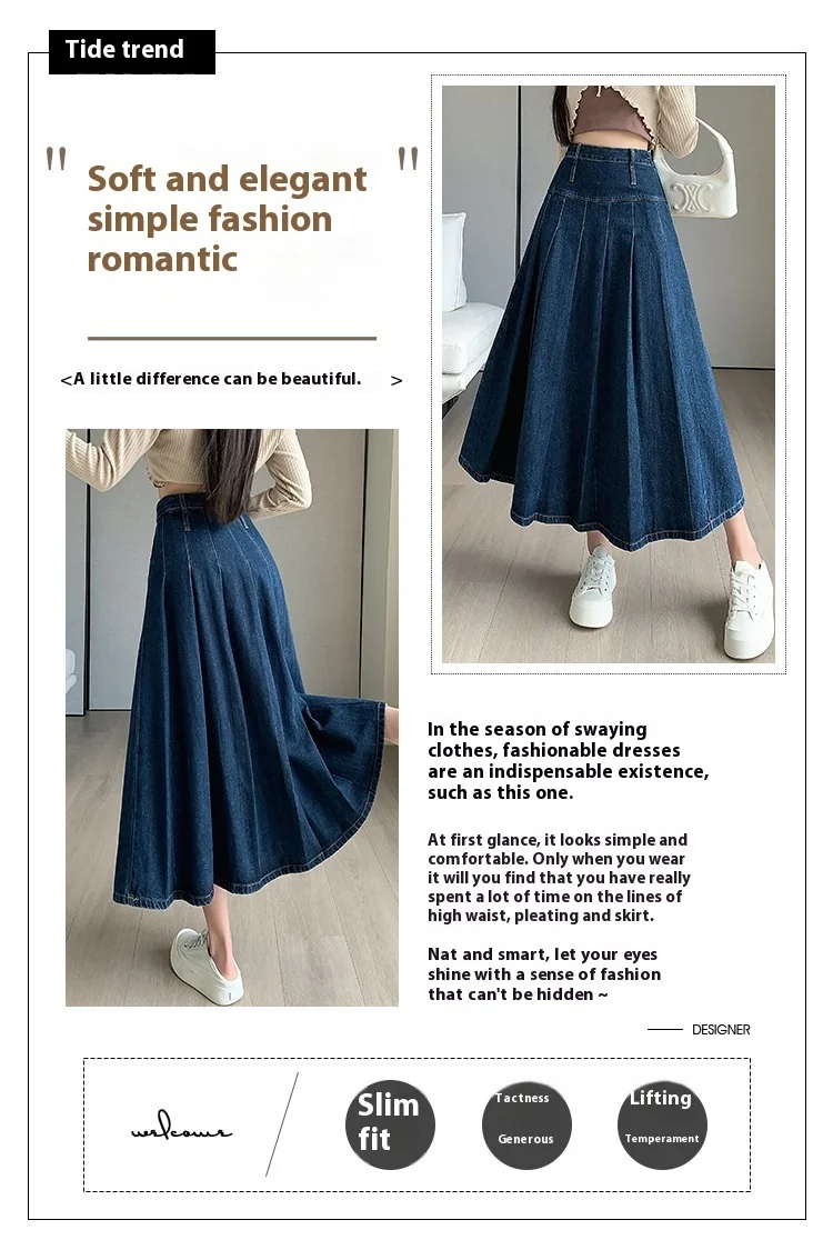 تنورة جينز طويلة بستايل رجعي، خصر مرن بتصميم مطوي يساعد على تنحيف القوام، مثالية لإطلالات الخريف الكاجوال.