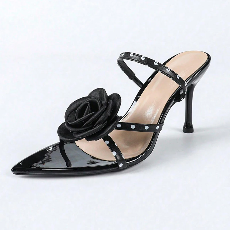 صنادل نسائية بكعب خنجر رفيع، تصميم مفتوح من الأمام ومزين بوردة أنثوية على المقدمة. بحزام خلفي مريح (Slingback) ولمسة فاخرة مثالية للحفلات والفساتين الرسمية. ---