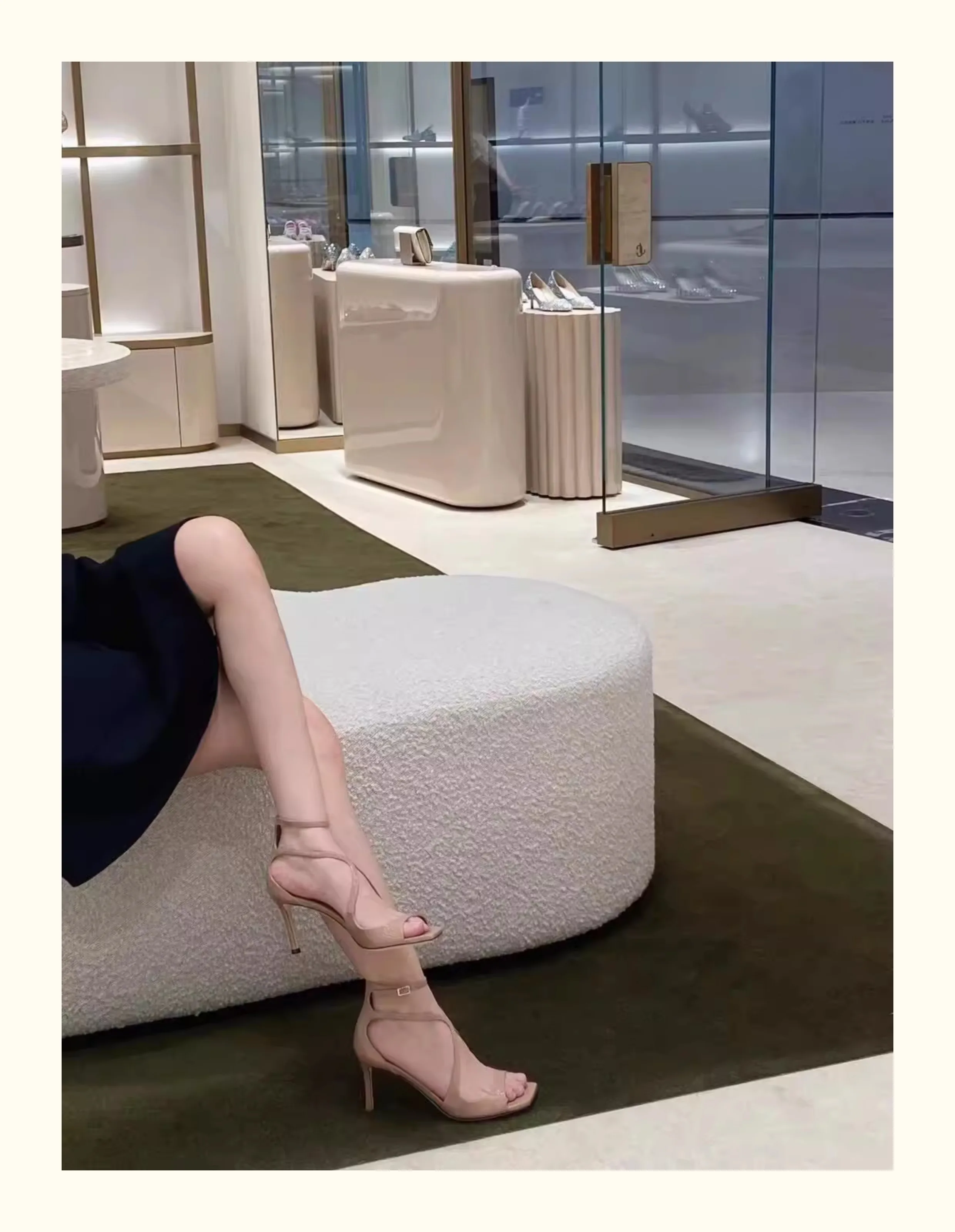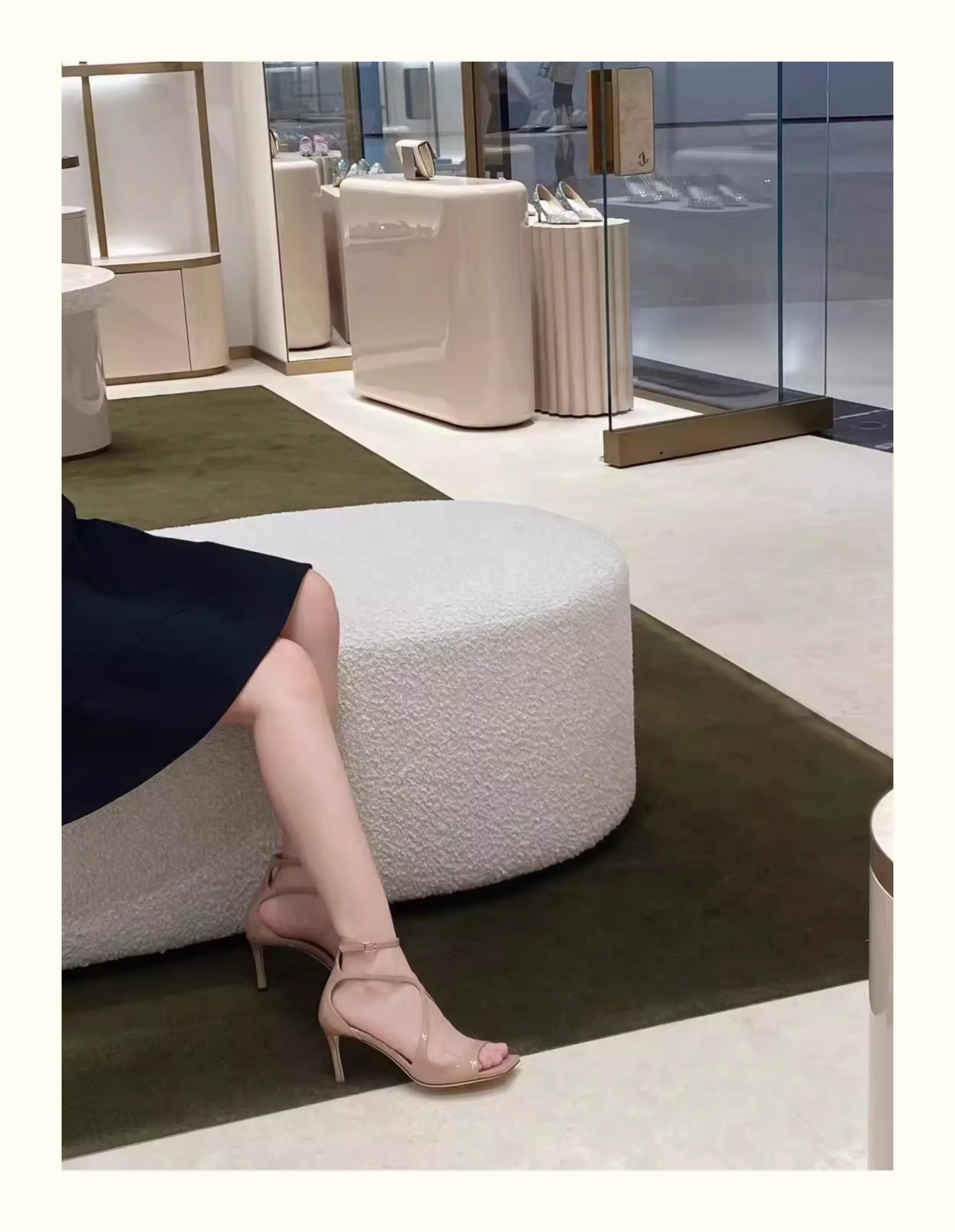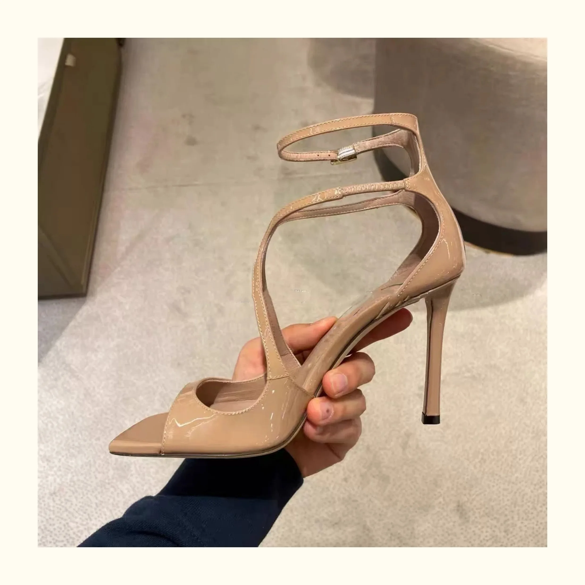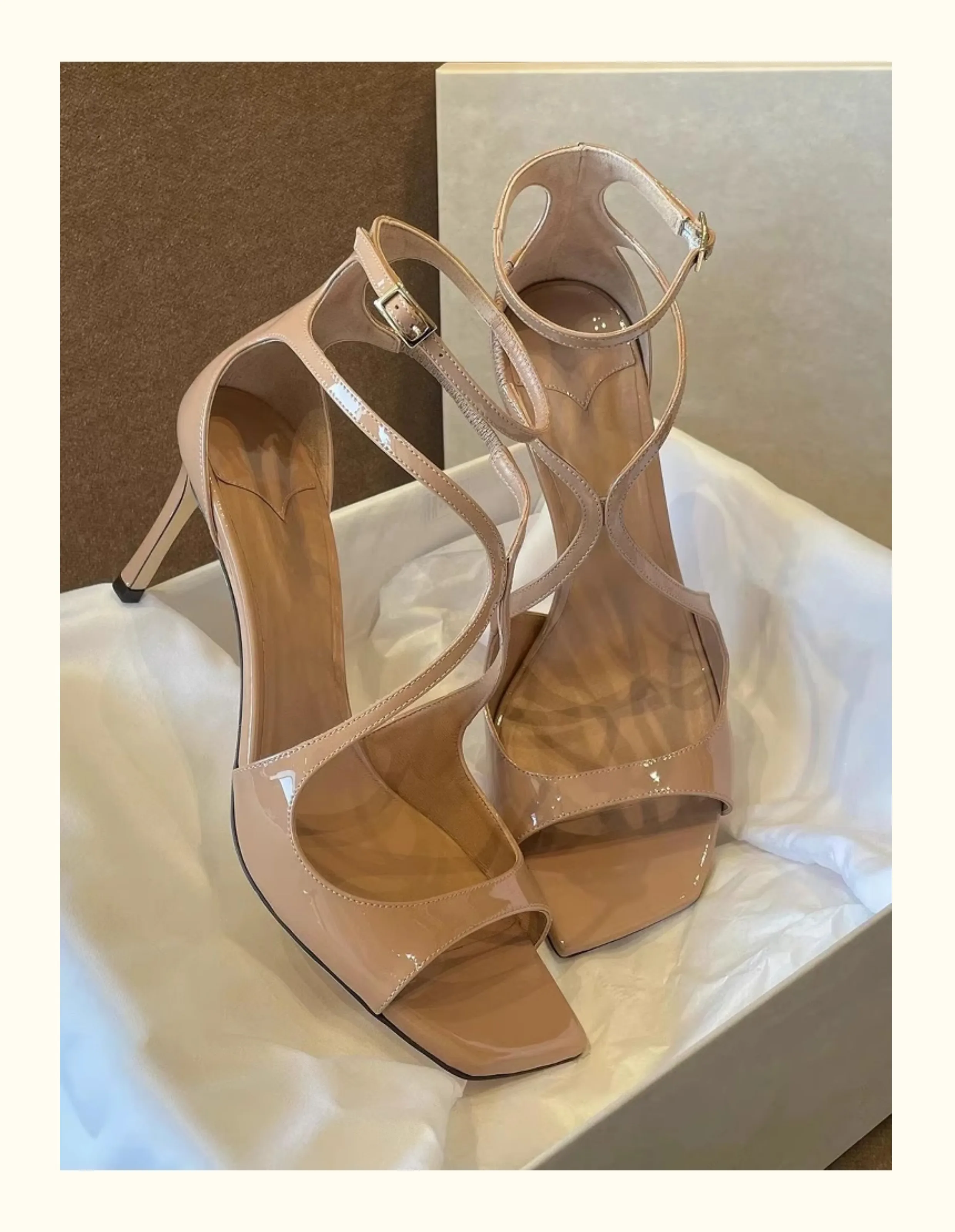 صندل مفتوح أنيق يعزز جمال القدم، بتصميم عصري ومقدمة مربعة مع فتحة فم السمكة وكعب رفيع يطيل القامة. اللون النود اللامع يضفي فخامة ناعمة وجاذبية هادئة.