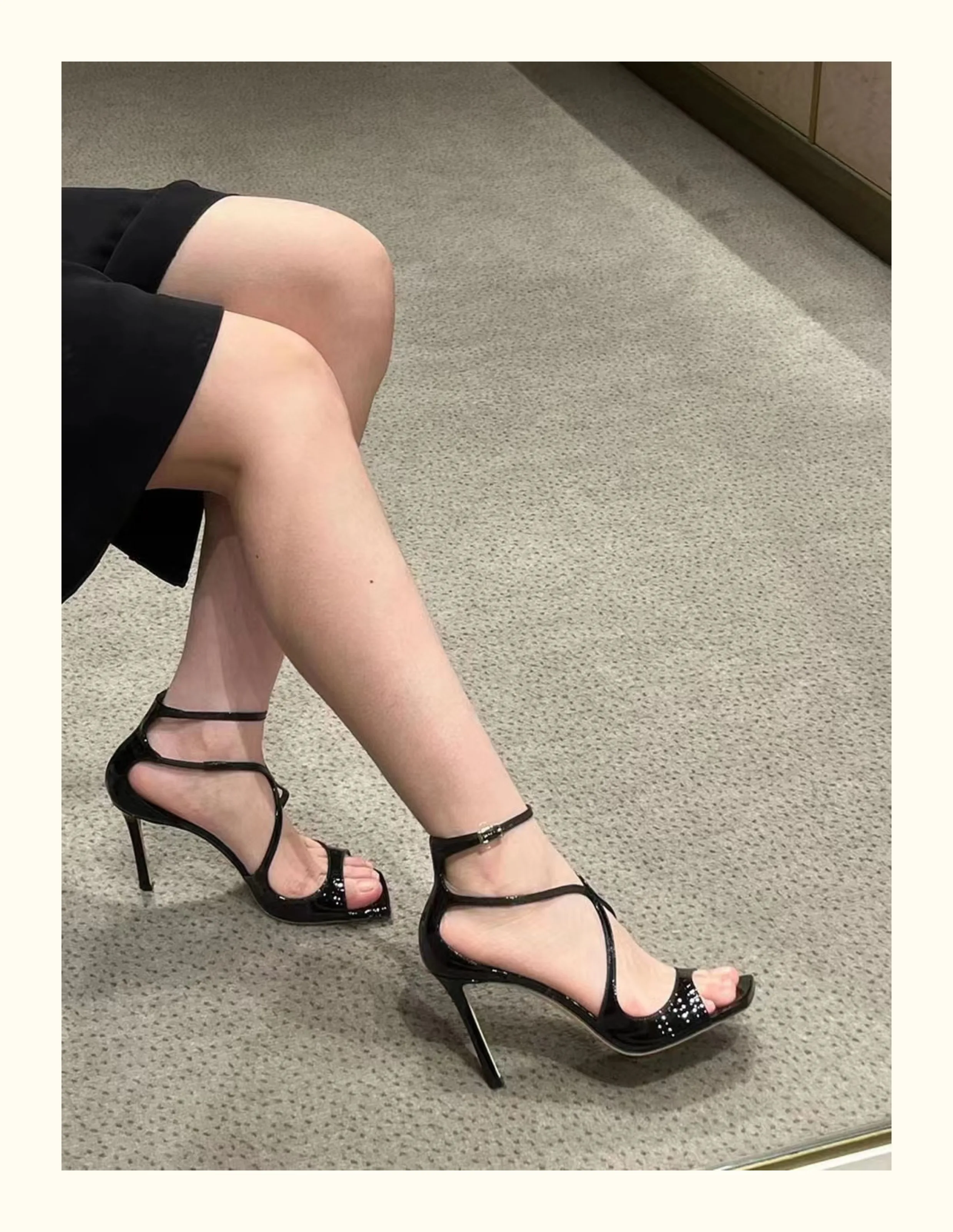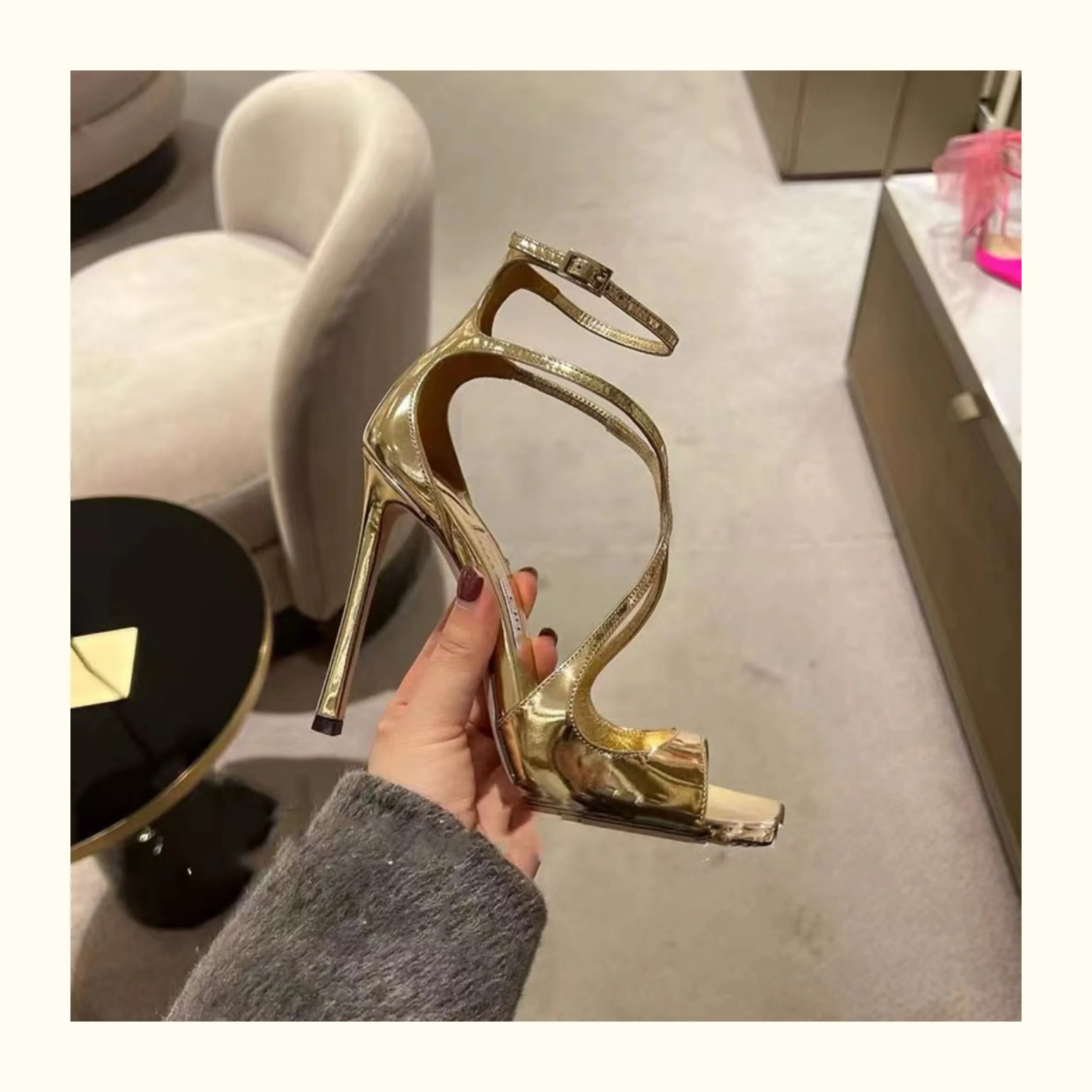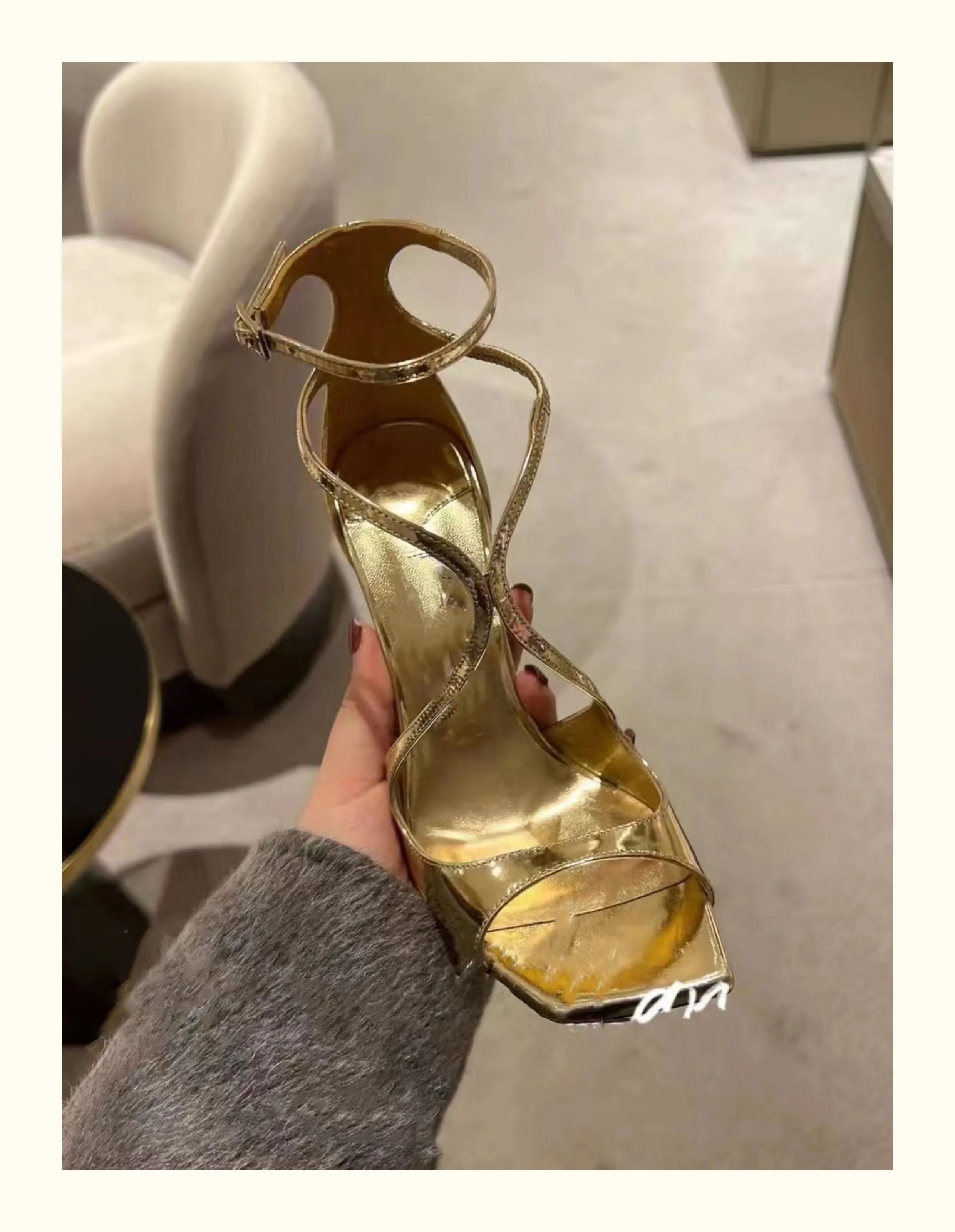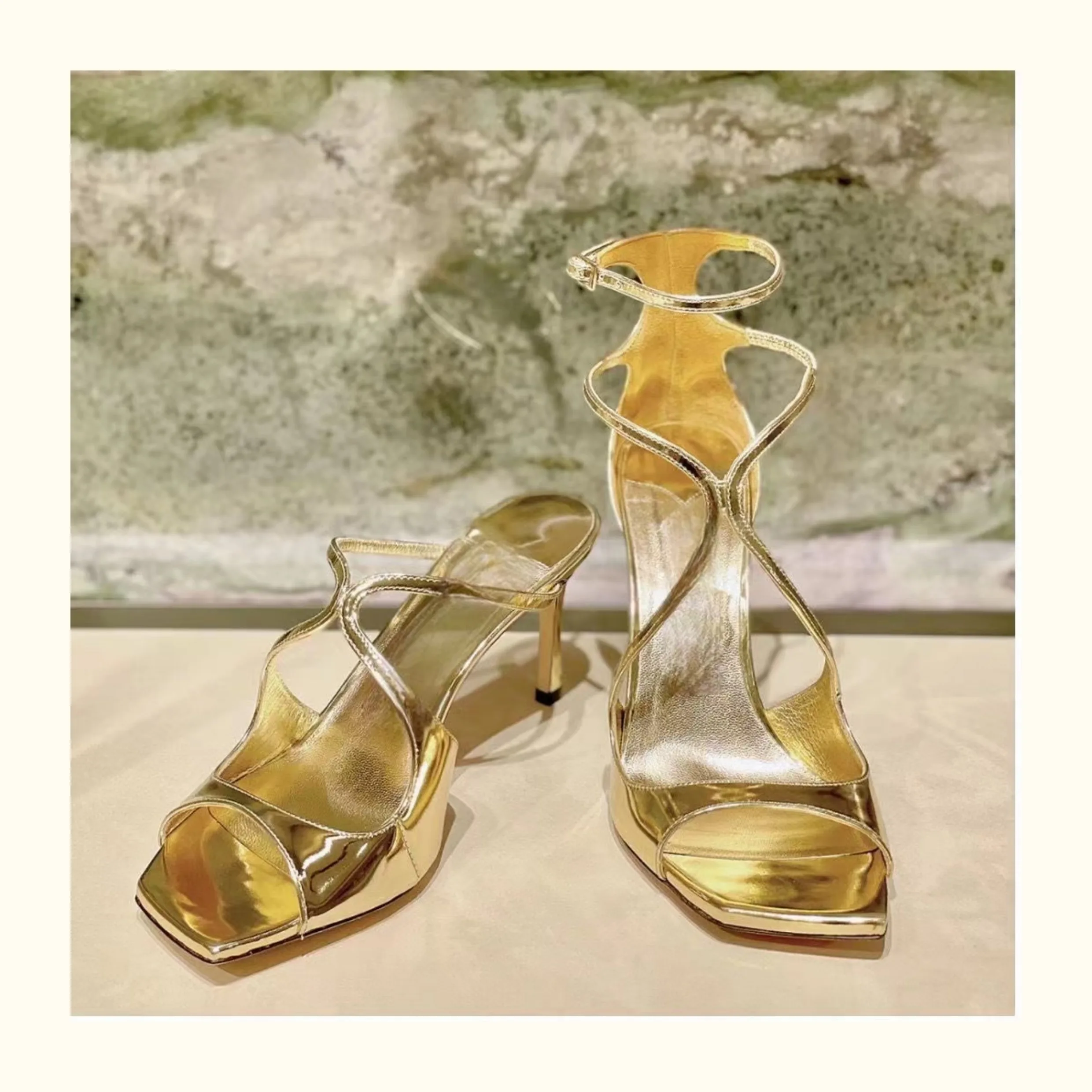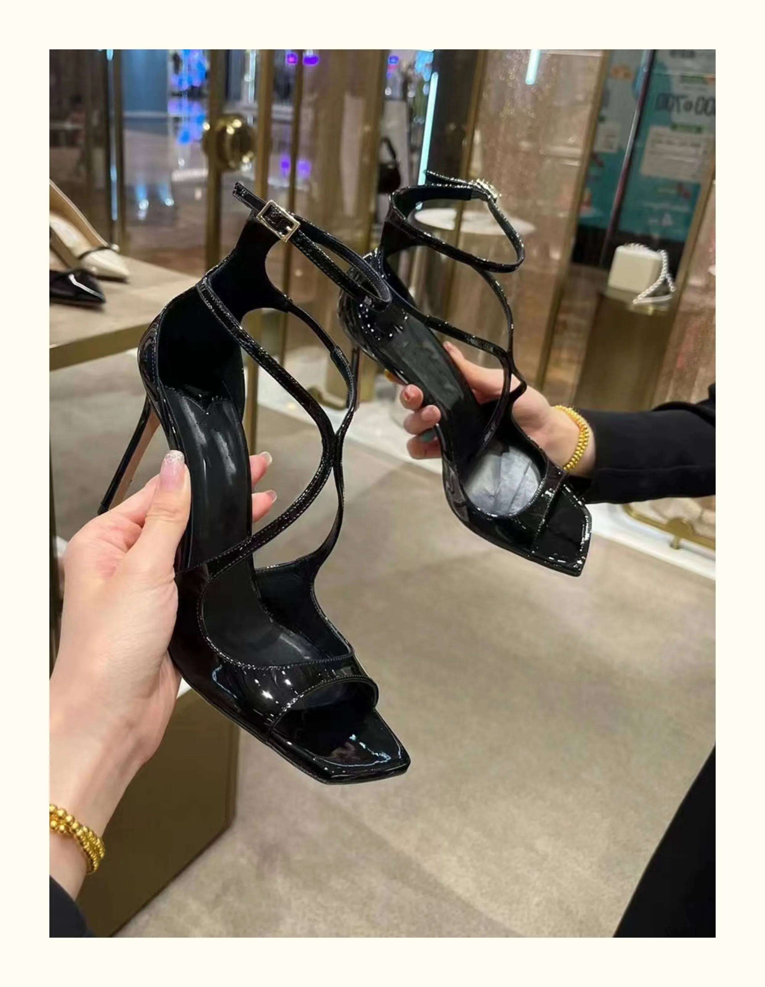 صندل مفتوح أنيق يعزز جمال القدم، بتصميم عصري ومقدمة مربعة مع فتحة فم السمكة وكعب رفيع يطيل القامة. اللون النود اللامع يضفي فخامة ناعمة وجاذبية هادئة.