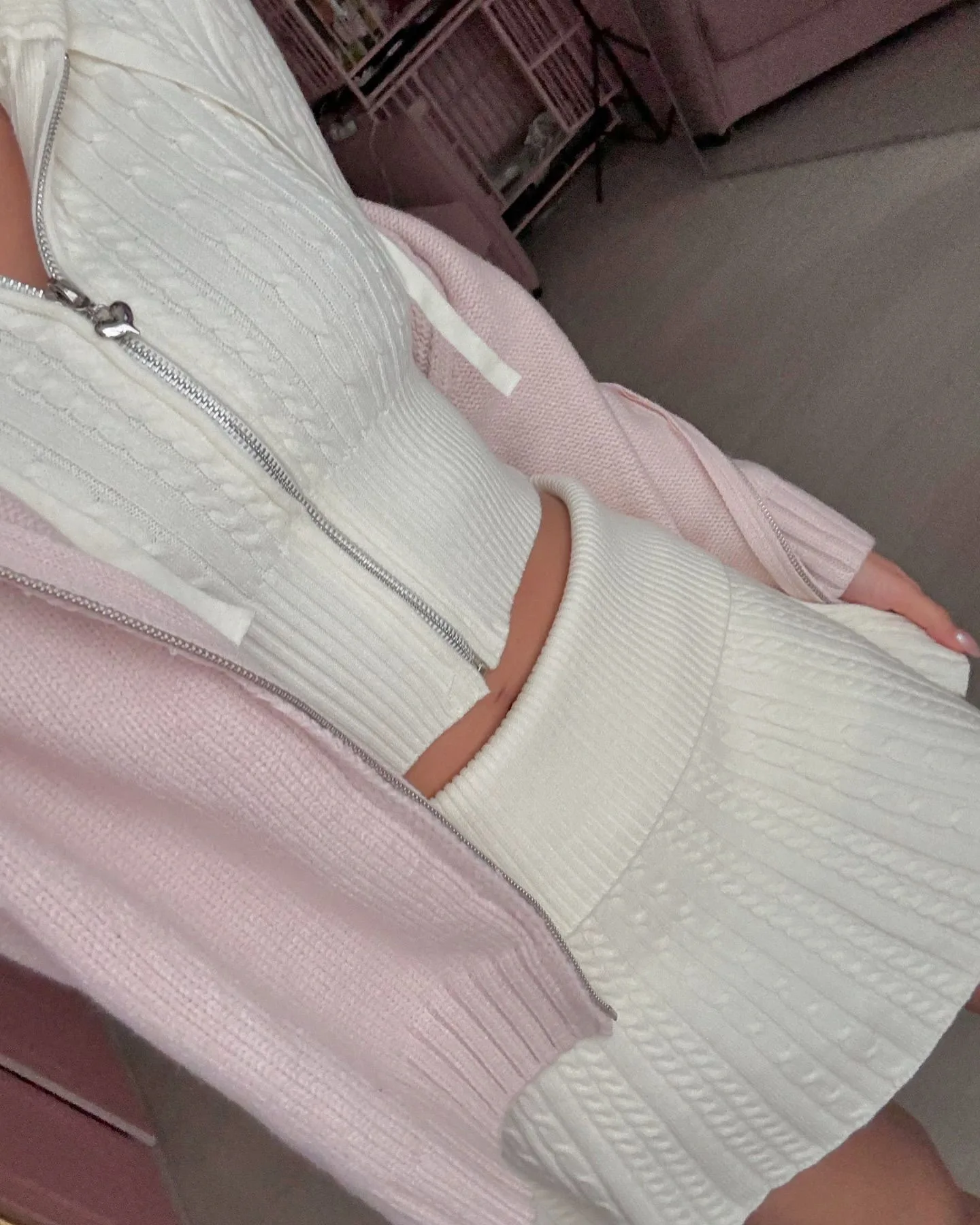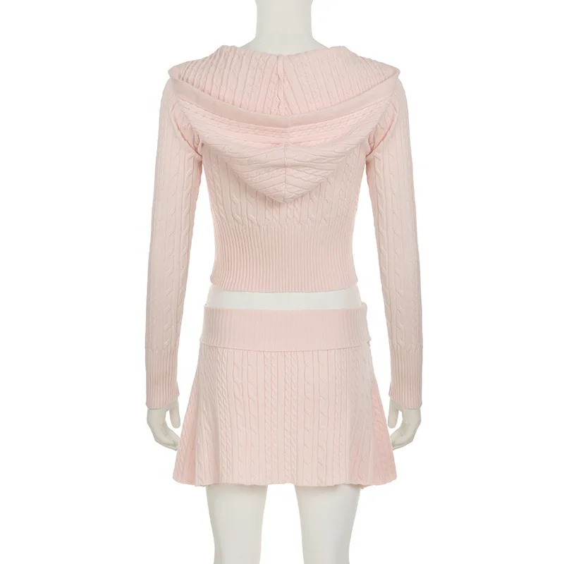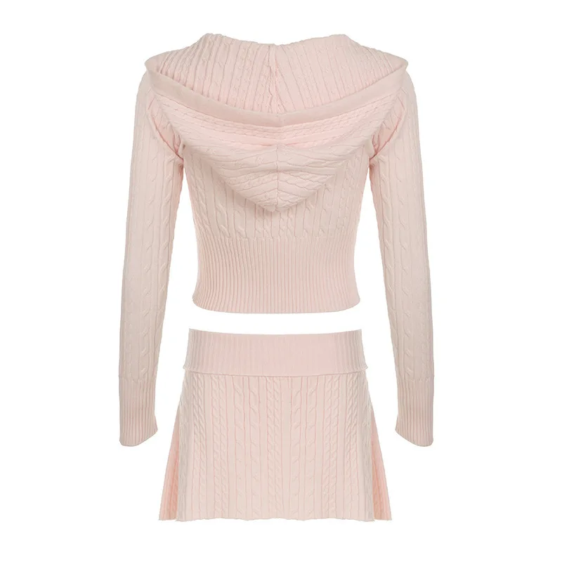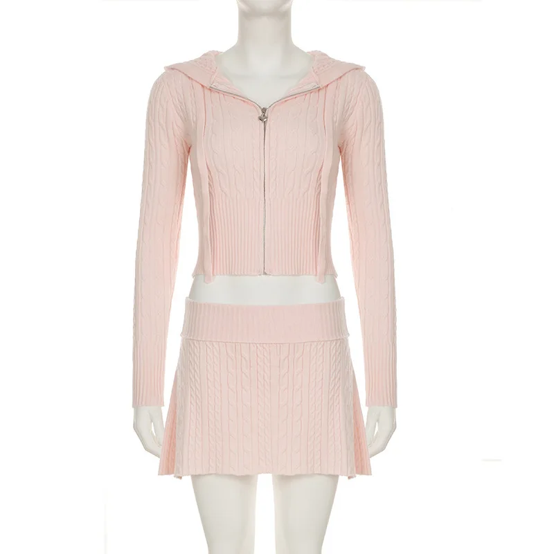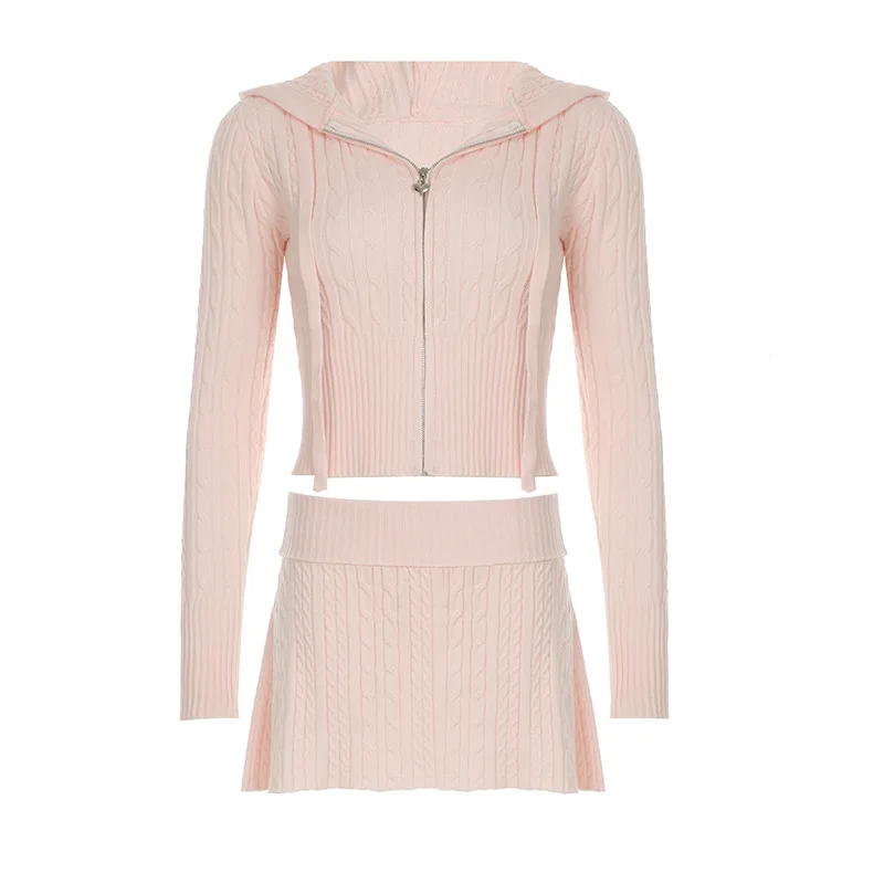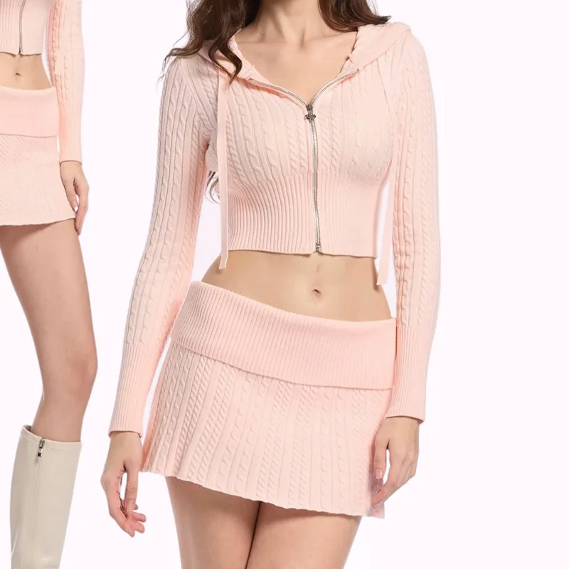 طقم أنيق مكون من قطعتين، هوديي بسحاب وتنورة عالية الخصر بلمسة مضلعة مثالية لأناقة الخريف والربيع.