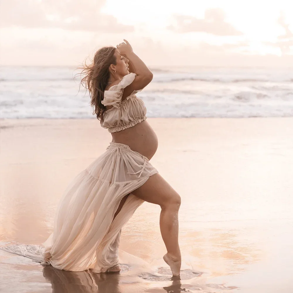 فستان شيفون ناعم بتصميم بدون أكتاف، مخصص للحوامل من أجل جلسات التصوير الفوتوغرافي أو حفلات Baby Shower، يمنح إطلالة حالمة وأنثوية توثق أجمل لحظات الحمل.