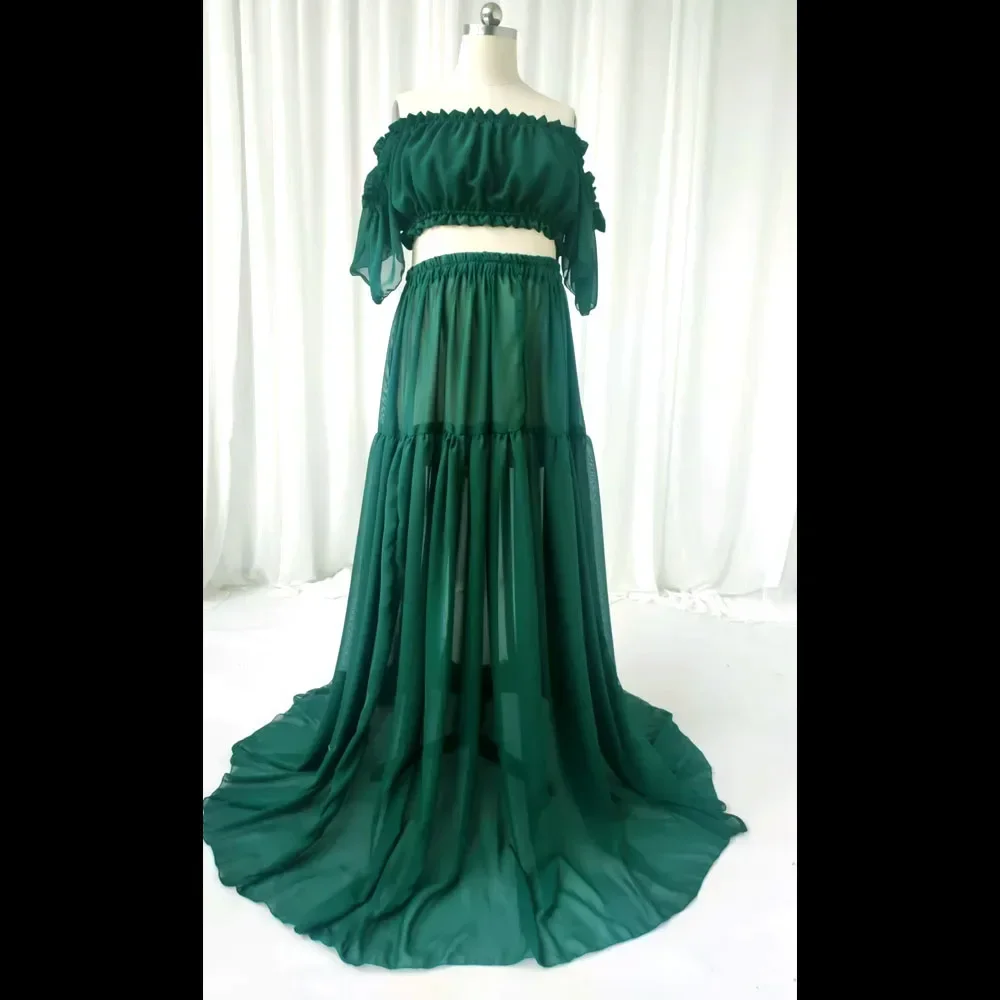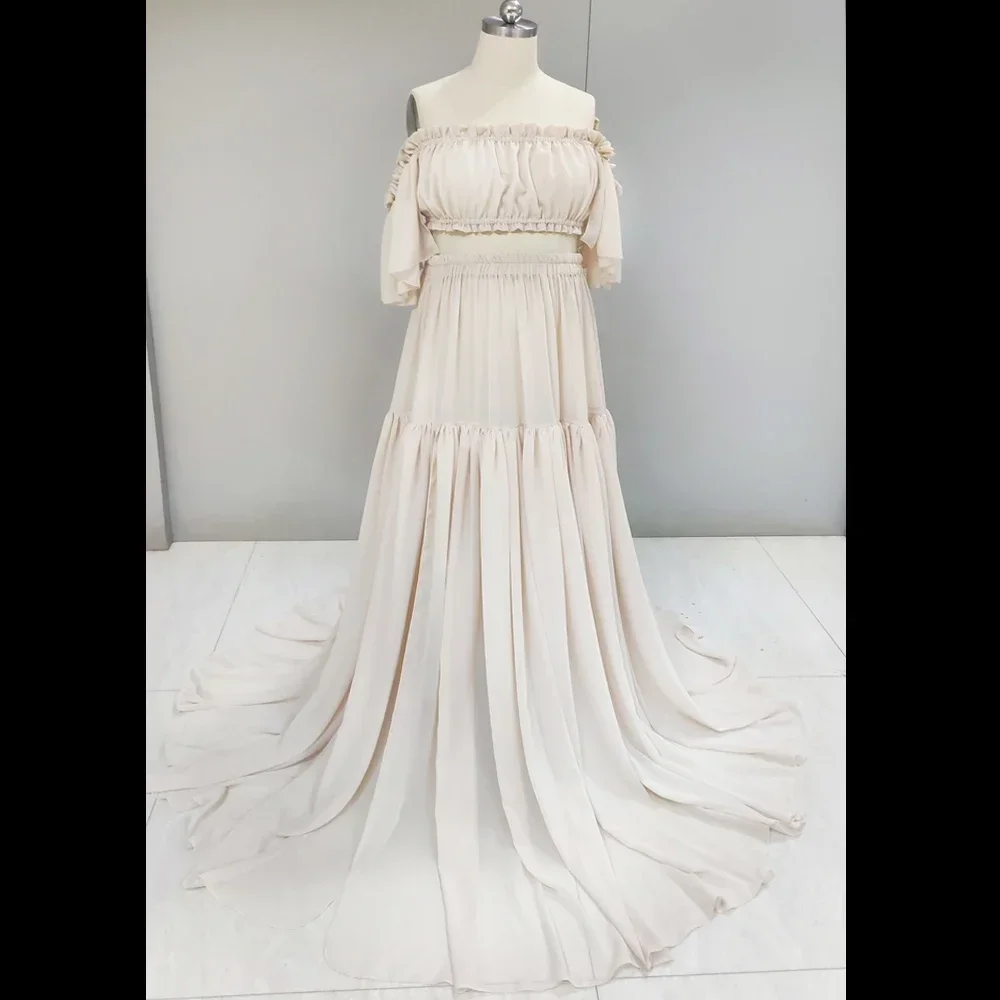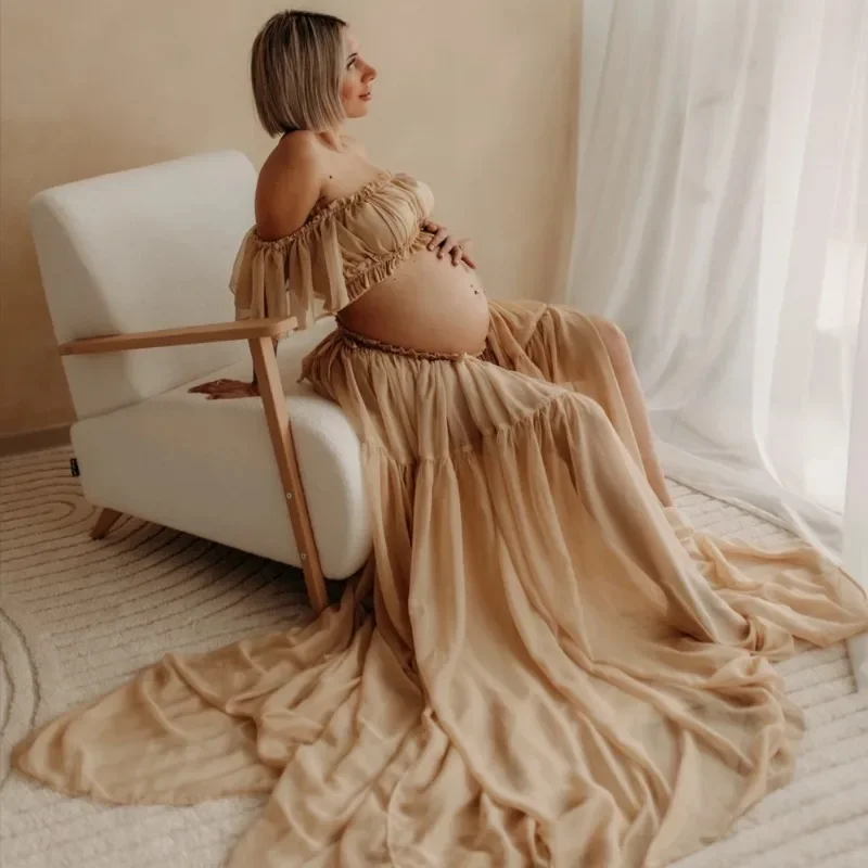 فستان شيفون ناعم بتصميم بدون أكتاف، مخصص للحوامل من أجل جلسات التصوير الفوتوغرافي أو حفلات Baby Shower، يمنح إطلالة حالمة وأنثوية توثق أجمل لحظات الحمل.