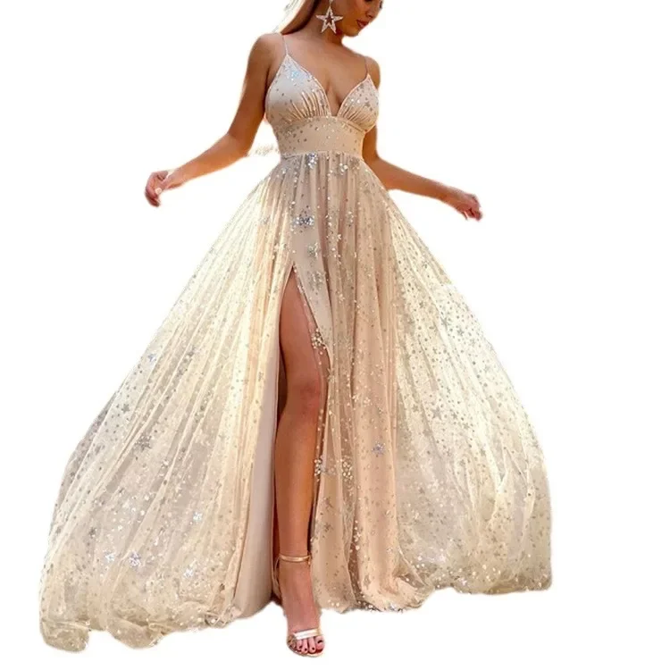 فستان دباب بدون أكمام بتفاصيل كريستالية فاخرة، بقصة تحدد الخصر وفتحة أنيقة، مثالي لإطلالة صيفية ملفتة مستوحاة من الموضة الأوروبية والأمريكية.