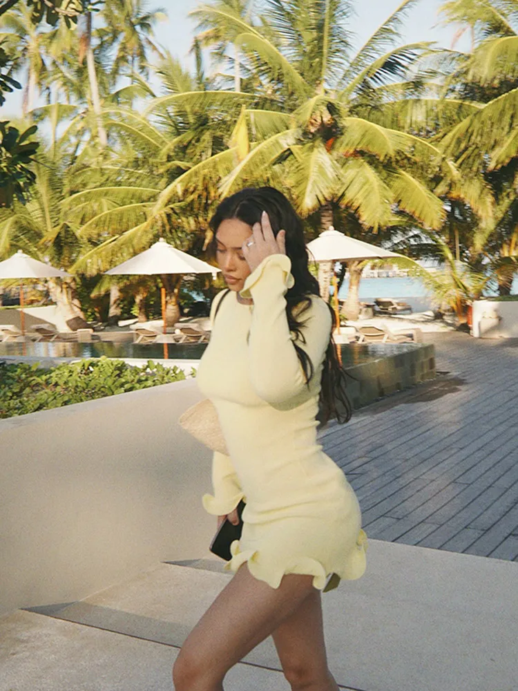 فستان أنيق من الشيفون الشبكي بطول ميدي وتصميم غير منتظم، يتميز بكشكش بطيات متعددة وكمّات فانوس أنثوية تضيف لمسة من الرقي والعصرية. مثالي لإطلالات الشارع الأنيقة أو السهرات الخفيفة.