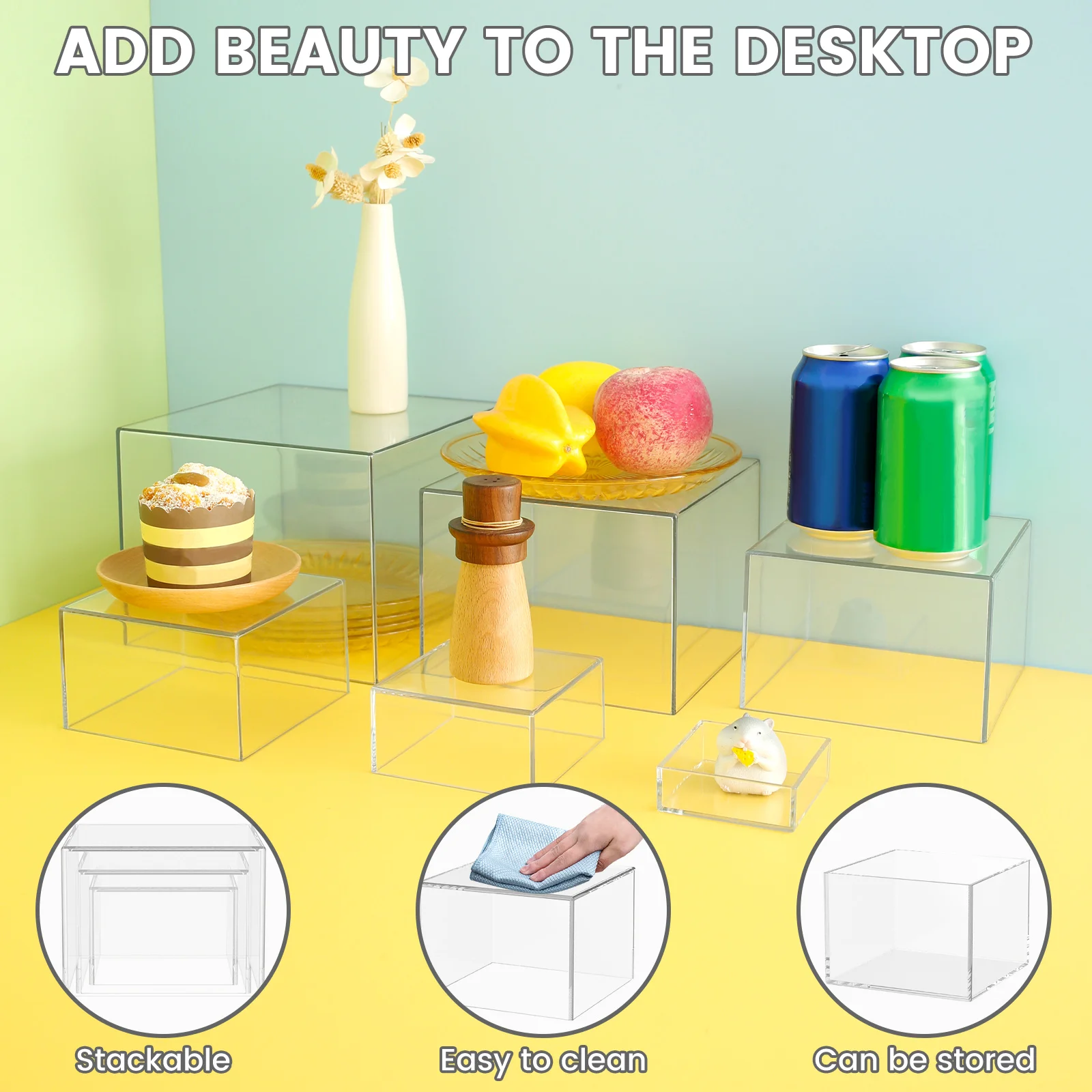 رتبي الحلويات والمقبلات بطريقة فاخرة مع مجموعة عرض الطعام المصنوعة من الأكريليك الشفاف، تشمل 6 قواعد بأحجام مختلفة يمكن تكديسها أو استخدامها بشكل منفصل لعرض الكيك، التحلية، أو المقبلات في البوفيهات. مثالية لحفلات الزفاف، أعياد الميلاد، أو الفعاليات الرسمية، وتمنح طاولتك مظهرًا أنيقًا ومنظمًا.