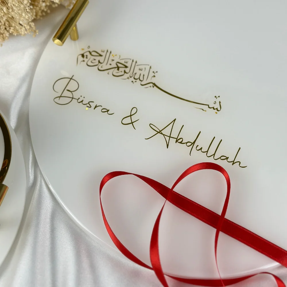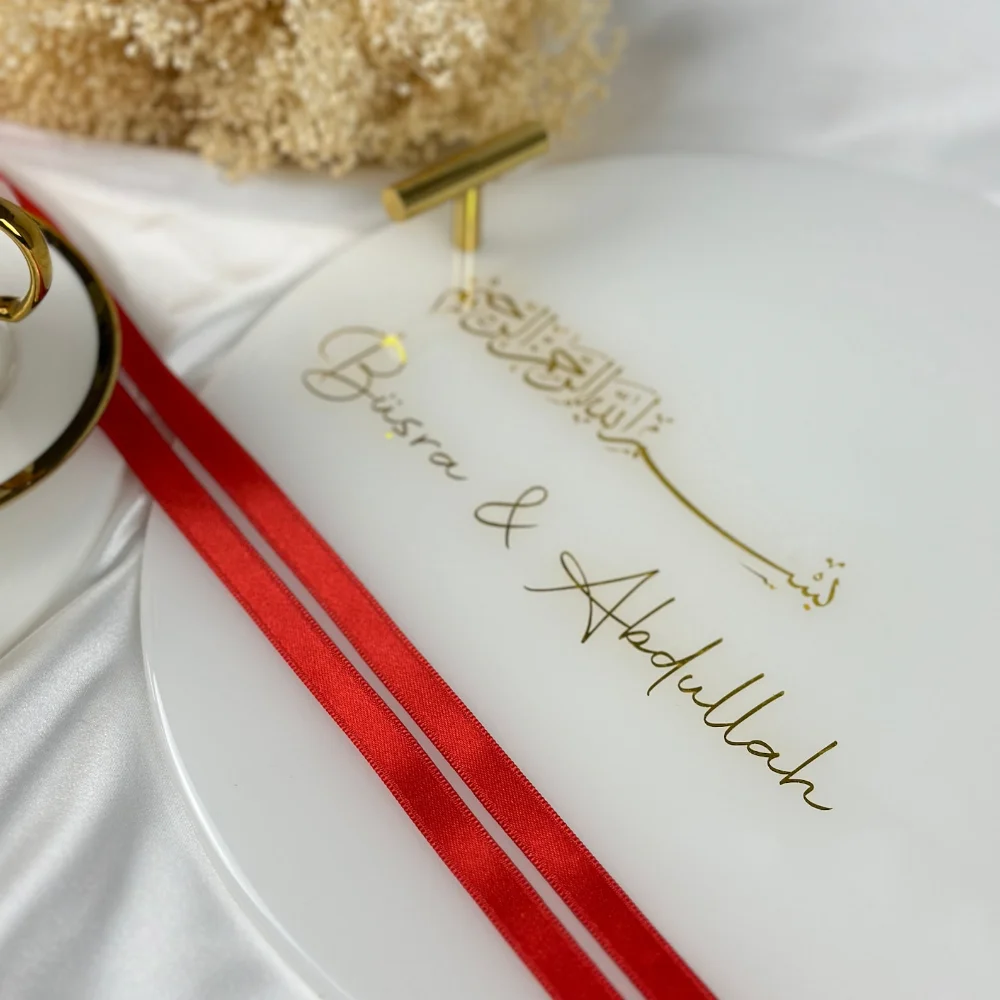 ملصق فينيل فاخر بلون ذهبي لامع بتصميم مخصص بأسماء العروسين أو تاريخ الزفاف، مثالي لتزيين صينية الخواتم، علبة الخطوبة، أو هدايا العرس. لمسة أنيقة وشخصية تزيد من جمال المناسبة.