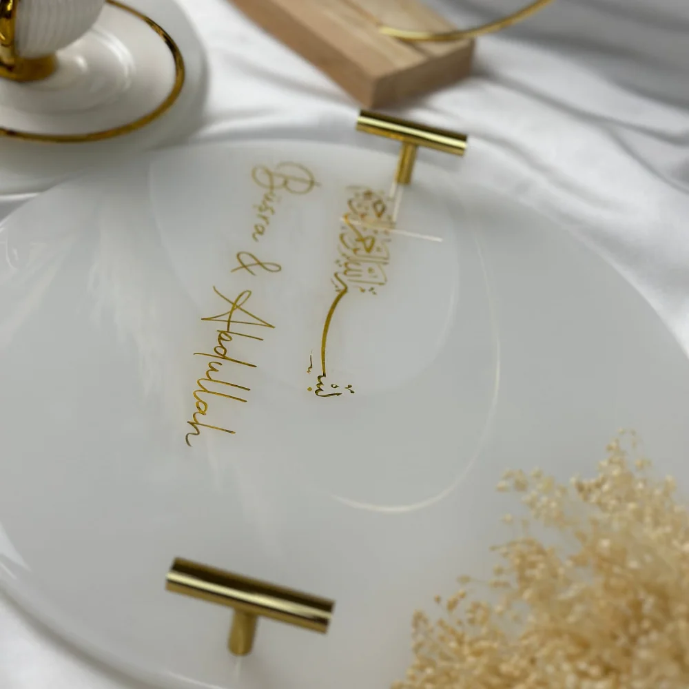 ملصق فينيل فاخر بلون ذهبي لامع بتصميم مخصص بأسماء العروسين أو تاريخ الزفاف، مثالي لتزيين صينية الخواتم، علبة الخطوبة، أو هدايا العرس. لمسة أنيقة وشخصية تزيد من جمال المناسبة.