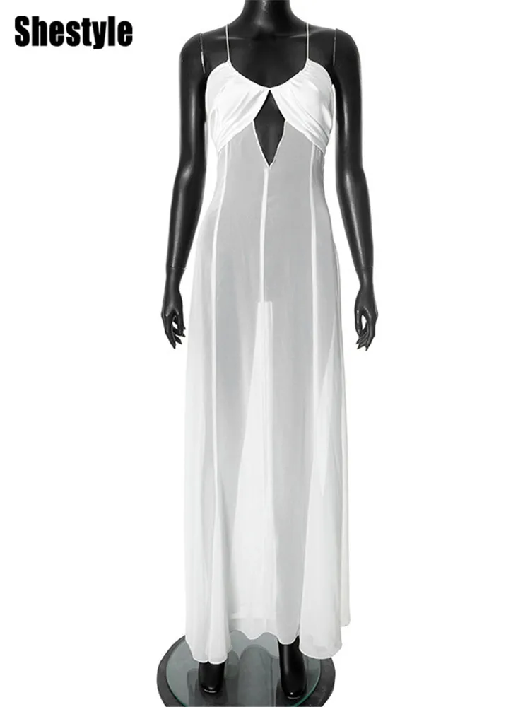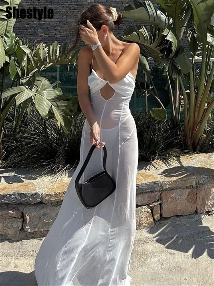 فستان صيفي شفاف بإلهام حورية البحر من Shestyle، تصميم بدون ظهر، بحمالات سباغيتي وفتحة رقبة V أنثوية. يتميز بتفاصيل جذابة وقصة مجوفة تمنحك إطلالة ساحرة مثالية لعطلات الشاطئ وأيام الصيف الساخنة.